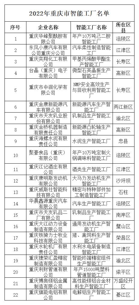近日,重慶市經(jīng)濟(jì)和信息化委員會公布了2022年智能工廠和數(shù)字化車間名單,其中智能工廠22個,數(shù)字化車間160個。詳情如下:重慶市經(jīng)濟(jì)和信息化委員會關(guān)于公布2022年重慶市智能工廠和數(shù)字化車間名單的通知 各區(qū)縣(自治縣)經(jīng)濟(jì)信息委,兩江新區(qū)、西部科學(xué)城重慶高新區(qū)、萬盛經(jīng)開區(qū)經(jīng)信部門,有關(guān)企業(yè): 為加快...