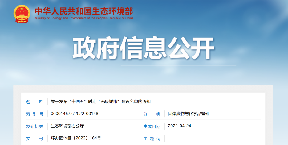 關(guān)于發(fā)布“十四五”時(shí)期“無(wú)廢城市”建設(shè)名單的通知各省、自治區(qū)、直轄市生態(tài)環(huán)境廳(局): 為落實(shí)《中共中央 國(guó)務(wù)院關(guān)于深入打好污染防治攻堅(jiān)戰(zhàn)的意見(jiàn)》和《“十四五”時(shí)期“無(wú)廢城市”建設(shè)工作方案》(以下簡(jiǎn)稱《工作方案》),我部會(huì)同有關(guān)部門,根據(jù)各省份推薦情況,綜合考慮城市基礎(chǔ)條件、工作積極性和國(guó)家相關(guān)重大...
