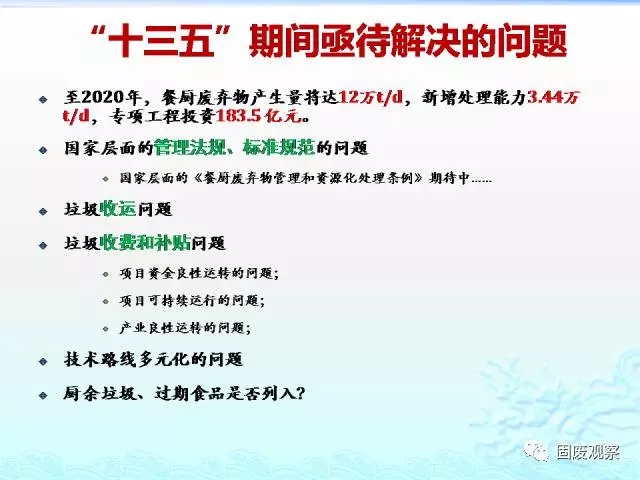 2017年1月下旬,國家發(fā)改委印發(fā)《戰(zhàn)略性新興產(chǎn)業(yè)重點(diǎn)產(chǎn)品和服務(wù)指導(dǎo)目錄》(2016版),將“餐廚廢棄物資源化無害化利用”的相關(guān)裝備和技術(shù)研發(fā),列入“資源循環(huán)利用產(chǎn)業(yè)”分項(xiàng)之一。將預(yù)示著“十三五”期間,餐廚垃圾市場又一次發(fā)展機(jī)遇。據(jù)任連海教授透露,國家層面的《餐廚廢棄物管理和資源化處理?xiàng)l例》已經(jīng)成文,餐廚垃圾處理市場運(yùn)營機(jī)制也有望進(jìn)一步明朗。預(yù)計(jì)該條例的推出,對進(jìn)一步規(guī)范餐廚垃圾管理將起到至關(guān)重要的作用。在政策逐步完善的發(fā)展條件下,餐廚垃圾處理行業(yè)將迎來巨大發(fā)展空間,十三五期間,餐廚垃圾市場預(yù)計(jì)將達(dá)1500-2000億。