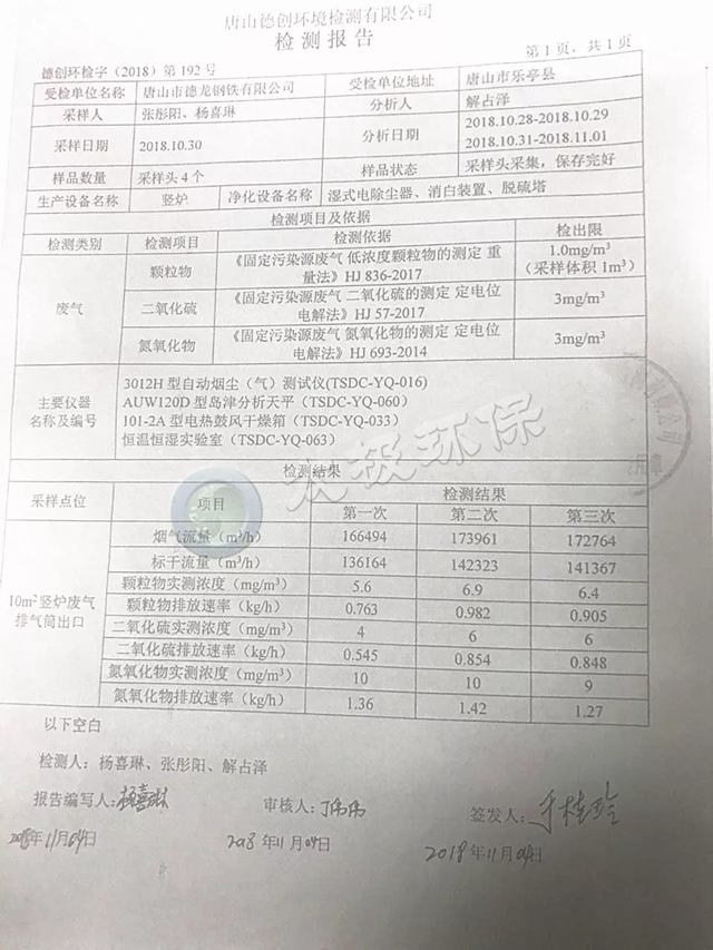 唐山德龍10m2豎爐脫硫除塵+脫白工程檢測報告