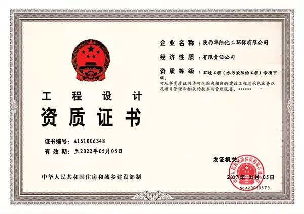 2017年5月5日,陜西華陸化工環(huán)保有限公司獲環(huán)境工程(水污染防治工程)專項設(shè)計甲級資質(zhì)證書。住房和城鄉(xiāng)建設(shè)部對照現(xiàn)行工程設(shè)計資質(zhì)標(biāo)準(zhǔn),經(jīng)過仔細篩選、反復(fù)核查申報材料,最終審核授予華陸環(huán)保環(huán)境工程(水污染防治工程)專項設(shè)計甲級資質(zhì)。本次從乙級資質(zhì)升級為甲級資質(zhì),是對華陸環(huán)保整體設(shè)計水平和綜合實力的全面考核。