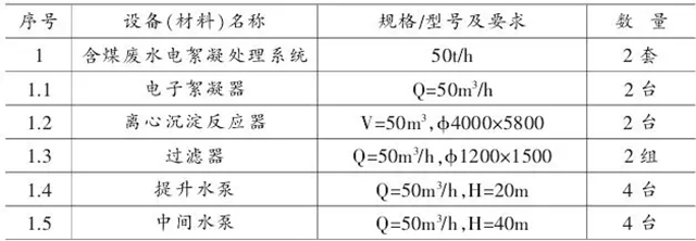 該套含煤廢水處理系統(tǒng)由:含煤廢水調(diào)節(jié)池、煤水提升泵、電子絮凝反器、離心澄清反應(yīng)器、中間水池、中間水泵、過(guò)濾器、回用水池、回用泵等組成,主要工藝設(shè)備見(jiàn)表1。