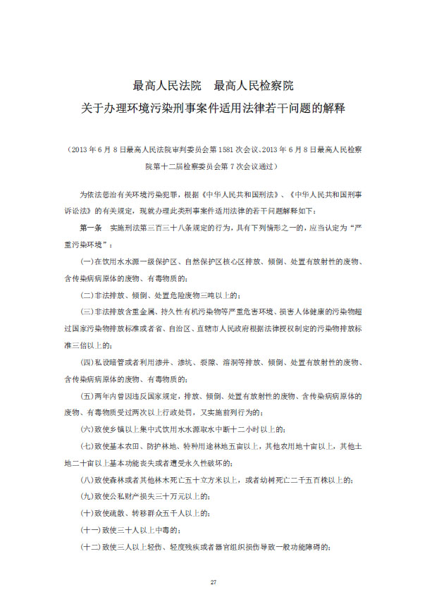 《最高人民法院、最高人民檢察院關(guān)于辦理環(huán)境污染刑事案件適用法律若干問題的解釋》已于2016年11月7日由最高人民法院審判委員會(huì)第1698次會(huì)議、2016年12月8日由最高人民檢察院第十二屆檢察委員會(huì)第58次會(huì)議通過,現(xiàn)予公布,自2017年1月1日起施行。