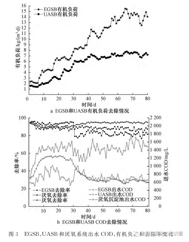 (2)穩(wěn)定運行時,EGSB、UASB和氧化溝的有機負荷分別為14.3kgCOD/(m3·d)、7.2kgCOD/(m3·d)和0.52kgCOD/(m3·d)時,COD去除率分別為87%、80%和90.8%。