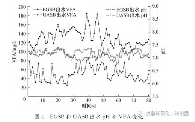 因而VFA及PH是厭氧系統(tǒng)的關鍵指標。EGSB和UASB進水、出水PH和VFA變化見圖4。從圖4可知,EGSB出水PH為7±0.2;UASB出水PH為7.2±0.2,UASB的出水PH高出EGSB0.2。