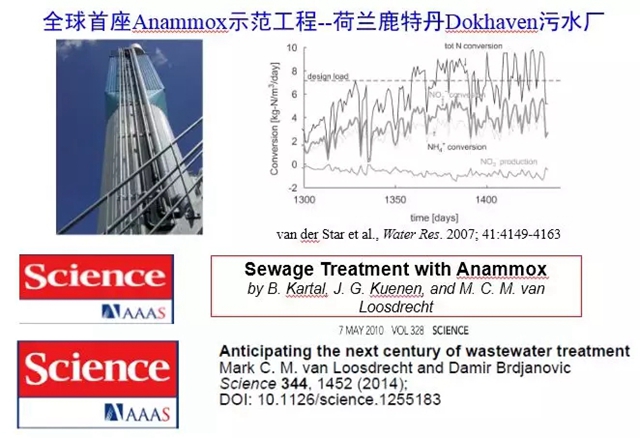 Kuenen教授的另一位主要助手Mark van Loosdrecht教授則在Anammox的實(shí)際應(yīng)用方面有很大的貢獻(xiàn)。他利用數(shù)學(xué)模型作為研究工具,并在公司的協(xié)助下,建立了全球第一座Anammox示范工程——荷蘭鹿特丹Dokhaven污水廠。他在2007年和2014年在《Science》上發(fā)表了關(guān)于厭氧氨氧化方面的文章。