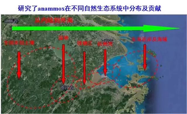 鄭平教授以前的學(xué)生--浙江大學(xué)胡寶蘭教授研究了Anammox細(xì)菌在中國(guó)不同自然生態(tài)系統(tǒng)中的分布及貢獻(xiàn)。她發(fā)現(xiàn),Anammox細(xì)菌廣泛存在于不同的自然生境中,且沉積物的有機(jī)碳和無(wú)機(jī)氮是影響Anammox分布的主要因素。她還發(fā)現(xiàn)人類活動(dòng)影響了Anammox菌的分布,甚至特定Anammox菌可作為人類活動(dòng)的指示菌。