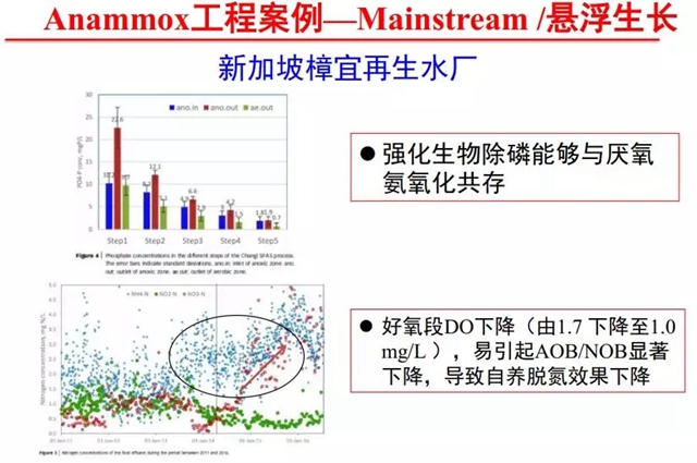 除了污泥消化液、工業(yè)廢水,近五年全球擴(kuò)大了對(duì)Anammox在城市污水主流程中的應(yīng)用。新加坡樟宜再生水廠是新加坡最大的再生水廠,也是國(guó)際上首個(gè)強(qiáng)化生物除磷與厭氧氨氧化在大型污水廠共存的案例。短污泥齡和適宜溶解氧是實(shí)現(xiàn)懸浮游離厭氧氨氧化菌生長(zhǎng)的必要條件,在好氧區(qū)實(shí)現(xiàn)部分硝化和亞硝酸鹽積累,缺氧區(qū)進(jìn)行厭氧氨氧化反應(yīng)(脫氮貢獻(xiàn)率30%),整體工藝能耗降低10%-30%,池容減少10%-40%。新加坡公用事業(yè)局的科學(xué)家曹業(yè)始博士在該污水廠Anammox技術(shù)的設(shè)計(jì)和應(yīng)用中發(fā)揮了重要作用。