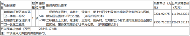 江西省贛州蓉江新區(qū)城鄉(xiāng)環(huán)衛(wèi)一體化項目發(fā)布中標結果公告,龍馬環(huán)衛(wèi)和中聯(lián)環(huán)境分獲一、二標段。其中,一標段中標金額達1.08億,二標段中標金額達1.15億,項目總金額達2.23億。