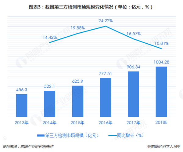 根據(jù)前瞻產(chǎn)業(yè)研究院發(fā)布的《中國第三方檢測行業(yè)發(fā)展趨勢與投資決策支持研究報告》數(shù)據(jù)顯示,2017年我過第三方檢測市場規(guī)模在900億元左右,近年來維持在10%以上的較高增速。預(yù)計2018全年第三方檢測市場規(guī)模將突破千億元大關(guān),我國第三方檢測市場將達(dá)到新的高度。
