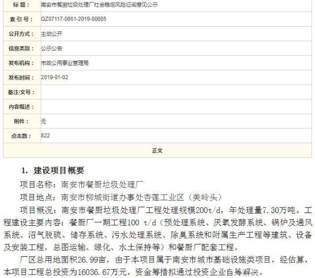2019年1月2日,南安市政公用事業(yè)管理局發(fā)布兩份《社會穩(wěn)定風險征詢意見公示》,主要內(nèi)容關(guān)于南安市生活垃圾焚燒發(fā)電廠提級改造,以及南安市餐廚垃圾處理廠建設(shè)兩項工程。具體如下: