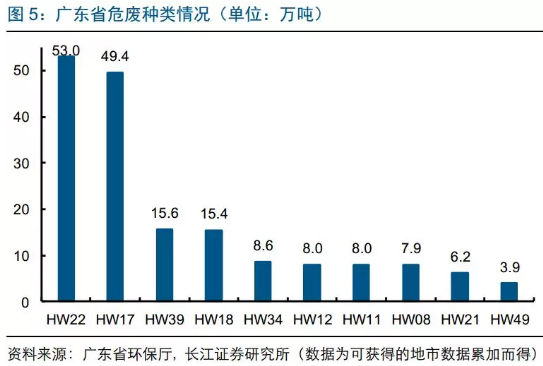 廣東省危廢種類中前5位的HW08(含油污泥,96.8萬(wàn)噸,占總資質(zhì)的20%)/HW22(含銅廢物,76.7萬(wàn)噸,占總資質(zhì)的15%)/HW17(表面處理污泥,56.3萬(wàn)噸,占總資質(zhì)的11%)/HW49(其他廢物,50.2萬(wàn)噸,占總資質(zhì)的10%)/HW48(有色金屬冶煉廢物,26.6萬(wàn)噸,占總資質(zhì)的5%)合計(jì)占總資質(zhì)61%,危廢資質(zhì)種類集中度高。