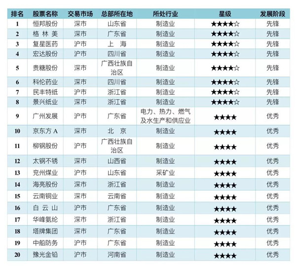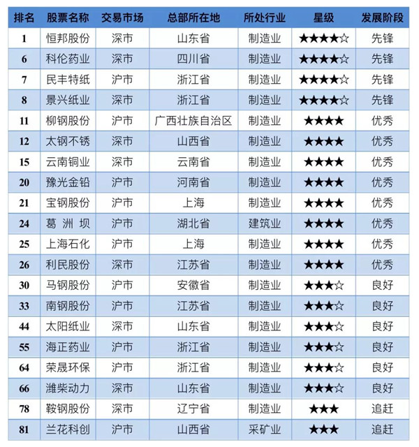 2.上市公司排名前20的企業(yè)名單。上市公司環(huán)境信息披露排名前十的企業(yè):恒邦股份、格林美、復(fù)星醫(yī)藥、宏達(dá)股份、貴糖股份、科倫藥業(yè)、民豐特紙、景興紙業(yè)、廣州發(fā)展、京東方A,其中前8家評(píng)級(jí)為四星半級(jí),后兩家被評(píng)為四星級(jí)。