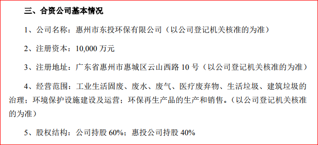 公告顯示,東江環(huán)保擬與與惠州市投資管理集團(tuán)有限公司(簡稱“慧投公司”)共同出資在惠州市成立合資公司,公司名擬定為“惠州市東投環(huán)保有限公司”,注冊資本1億元,東江環(huán)保與慧投公司分別出資6000萬與4000萬元人民幣,分別持股60%和40%的股權(quán)。