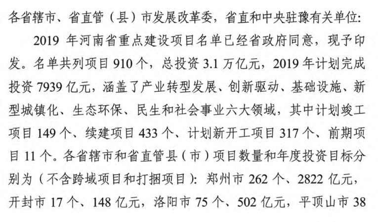 2月11日,河南省發(fā)改委發(fā)布《關(guān)于印發(fā)2019年河南省重點建設(shè)項目名單的通知》。名單共列項目910個,總投資3.1萬億元,2019年計劃完成投資7939億元,涵蓋了產(chǎn)業(yè)轉(zhuǎn)型發(fā)展、創(chuàng)新驅(qū)動、基礎(chǔ)設(shè)施、新型城鎮(zhèn)化、生態(tài)環(huán)保、民生和社會事業(yè)六大領(lǐng)域18個行業(yè)。其中計劃竣工項目149個、續(xù)建項目433個、計劃新開工項目317個、前期項目11個。