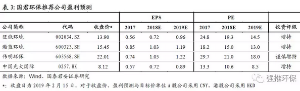 配置垃圾焚燒板塊中處于成長期的龍頭公司,推薦產(chǎn)能釋放加速、盈利能力改善、項(xiàng)目優(yōu)質(zhì)的公司,包括:1)2019年為產(chǎn)能釋放大年、利潤率改善明顯的旺能環(huán)境;2)項(xiàng)目多位于浙江地區(qū)、盈利能力強(qiáng)的偉明環(huán)保;3)項(xiàng)目多位于珠三角地區(qū)、運(yùn)營穩(wěn)健的瀚藍(lán)環(huán)境;4)行業(yè)產(chǎn)能第一龍頭中國光大國際。