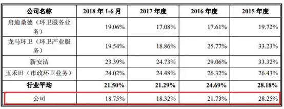 報告期內(nèi),僑銀環(huán)保毛利率分別為28.22%、21.72%、18.28%、18.75%,呈連續(xù)下降的態(tài)勢,雖然行業(yè)的毛利率也在下降,但下降幅度沒有僑銀環(huán)保大。
