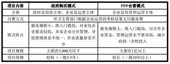 目前環(huán)境衛(wèi)生管理行業(yè)的經(jīng)營模式主要有兩種:一是政府購買服務(wù)模式,二是PPP合營模式。