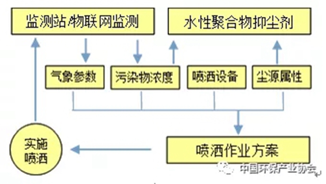 以環(huán)境空氣質(zhì)量監(jiān)測數(shù)據(jù)為依據(jù)、水性聚合物抑塵劑為主體、智慧化噴灑作業(yè)為實施方式,提高堆場和城區(qū)揚塵治理的有效性。根據(jù)PM2.5、PM10實時監(jiān)測結(jié)果及其變化趨勢,確定水性聚合物抑塵劑的用量和噴灑頻次,根據(jù)塵源屬性確定抑塵劑的品種,根據(jù)實時氣象參數(shù)、塵源狀態(tài)以及周邊環(huán)境狀況制定并實施噴灑作業(yè)方案。