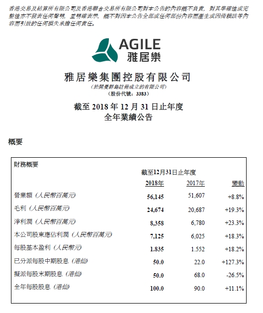 截至2018年12月31日,雅居樂營業(yè)額及毛利分別為人民幣561.45億元及人民幣246.74億元,較去年分別增加8.8%及19.3%。凈利潤為人民幣83.58億元,較去年上升23.3%。股東應(yīng)占利潤為人民幣71.25億元,較去年增加18.3%。整體毛利率及凈利潤率分別為43.9%及14.9%,較去年分別上升3.8個百分點及1.8個百分點。