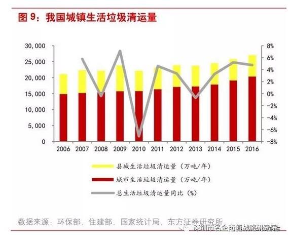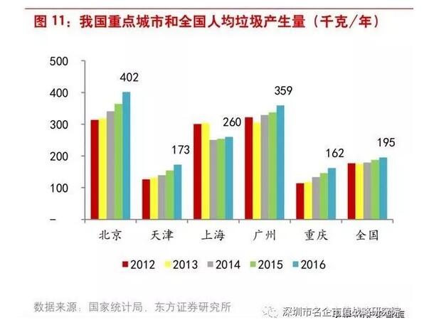 經(jīng)濟(jì)發(fā)展和城鎮(zhèn)化帶來(lái)的人均生活垃圾產(chǎn)量的不斷提高;根據(jù)國(guó)家統(tǒng)計(jì)局?jǐn)?shù)據(jù),2016 年我國(guó) 人均垃圾產(chǎn)生量為 195 千克/年。我國(guó)幾個(gè)重點(diǎn)城市之間差別比較大,其中北京的人均垃圾產(chǎn) 生量最高,達(dá)到 402 千克/年,重慶的人均垃圾產(chǎn)生量最低,為 162 千克/年,經(jīng)濟(jì)較發(fā)達(dá)且城 鎮(zhèn)率高的城市人均垃圾產(chǎn)生量也較高。參考國(guó)外,美國(guó)的人均垃圾產(chǎn)生量為 657 千克/年,達(dá) 到我國(guó)平均的 3.3 倍。我們認(rèn)為隨著我國(guó)經(jīng)濟(jì)的發(fā)展和城鎮(zhèn)化推進(jìn),人均垃圾產(chǎn)生量仍有較大的提升空間。