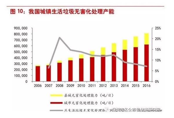 隨著我國(guó)經(jīng)濟(jì)發(fā)展、城鎮(zhèn)化水平提高及垃圾處理無(wú)害化處理率的提高,垃圾清運(yùn)量和無(wú)害化處理產(chǎn) 能每年穩(wěn)步增長(zhǎng)。2006-2016年間,我國(guó)城鎮(zhèn)生活垃圾清運(yùn)量由2.11億噸/年增長(zhǎng)至 2.70 億噸/年, 年均復(fù)合增長(zhǎng)率為 2.5%;我國(guó)城鎮(zhèn)生活垃圾無(wú)害化處理產(chǎn)能由 27.33 萬(wàn)噸/日增長(zhǎng)至 81.20 萬(wàn)噸/ 日,年均復(fù)合增長(zhǎng)率為 11.5%。與此同時(shí),我國(guó)生活垃圾無(wú)害化處理率也不斷提高。2016 年,我 國(guó)城鎮(zhèn)生活垃圾無(wú)害化處理率達(dá)到 94%,其中城市生活垃圾無(wú)害化處理率達(dá)到 96.6%,縣城無(wú)害 化處理率為 85.2%。