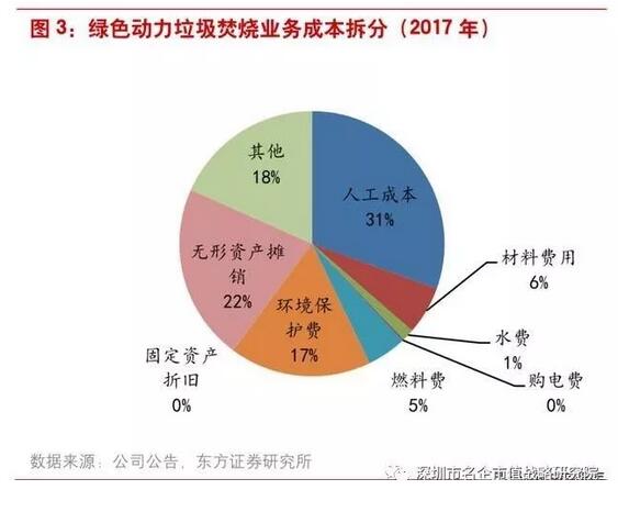 決定垃圾焚燒運(yùn)營(yíng)成本的主要因素包括:項(xiàng)目初始投資(決定折舊及攤銷),負(fù)債率及平均利率(決 定財(cái)務(wù)費(fèi)用),環(huán)保排放標(biāo)準(zhǔn)(決定環(huán)境保護(hù)費(fèi)、材料費(fèi)等),根據(jù)部分公司披露的項(xiàng)目運(yùn)營(yíng)成本 分析,綠色動(dòng)力垃圾焚燒業(yè)務(wù)的主要成本構(gòu)成為:人工成本(31%)、無(wú)形資產(chǎn)攤銷(22%)、環(huán) 境保護(hù)費(fèi)(17%)等。中國(guó)天楹的主要成本構(gòu)成為:折舊及攤銷(37%)、原材料(24%)、人工(20%)。無(wú)形資產(chǎn)攤銷主要來(lái)自于垃圾焚燒項(xiàng)目投資,一般采取直線法進(jìn)行攤銷。其他運(yùn)營(yíng)成本 包括檢修支出及檢測(cè)費(fèi)用等。