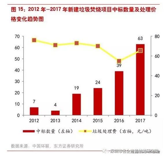 2) 垃圾焚燒處理費(fèi)價(jià)格穩(wěn)中有升:根據(jù)中國(guó)環(huán)聯(lián)的數(shù)據(jù)統(tǒng)計(jì),2012-2017 年,全國(guó)每年垃圾焚 燒項(xiàng)目招標(biāo)的數(shù)量逐漸增多。但在這個(gè)期間出現(xiàn)了惡性競(jìng)爭(zhēng),甚至有過(guò)以 20-30 元/噸超低價(jià) 中標(biāo)的極端情況,而行業(yè)普遍認(rèn)為的垃圾焚燒處理合理的價(jià)格區(qū)間應(yīng)為 60-80 元/噸。地方政 府在項(xiàng)目招標(biāo)時(shí)采用最低價(jià)中標(biāo)的方式,以及部分競(jìng)爭(zhēng)力有限的公司希望以低價(jià)投標(biāo)的策略迅 速搶占市場(chǎng)、擴(kuò)張規(guī)模,造成了2012-2016 年垃圾焚燒處置費(fèi)持續(xù)下降,2016 年全年中標(biāo)均 價(jià)僅為 54.85 元/噸。2017 年,價(jià)格止跌回升,增長(zhǎng)至 65.44 元/噸,項(xiàng)目的招標(biāo)數(shù)量也增加 至 63 個(gè)(2015、2016 年分別為 24 和 39 個(gè))。我們認(rèn)為隨著環(huán)保要求不斷提升,部分資金 和運(yùn)營(yíng)實(shí)力有限的公司正在逐步退出垃圾焚燒運(yùn)營(yíng)市場(chǎng),垃圾焚燒處理價(jià)格將維持在合理的水 平。上海環(huán)境、偉明環(huán)保等垃圾焚燒上市公司 2018 年新中標(biāo)的項(xiàng)目垃圾處理費(fèi)普遍在70-100 元/噸左右。