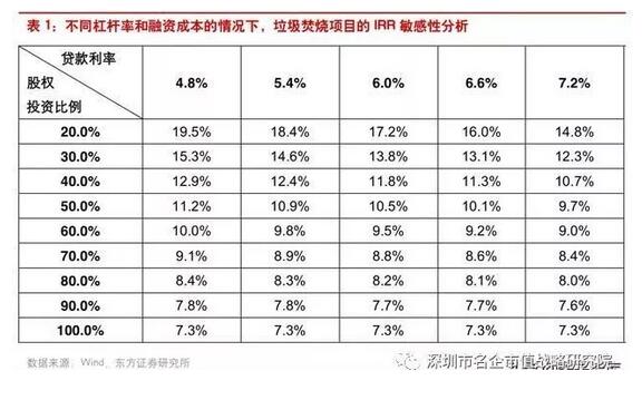 不同的股權(quán)投資比例和融資成本會(huì)顯著影響項(xiàng)目的收益率,當(dāng)融資寬松時(shí),融資比例上升,融資成 本下降,項(xiàng)目收益率上升;而在 2018 年去杠桿的背景下,項(xiàng)目的收益率也受到杠桿率下降和融資 成本上升的影響,但由于垃圾焚燒項(xiàng)目進(jìn)入運(yùn)營(yíng)期后擁有穩(wěn)定的現(xiàn)金流,屬銀行等金融機(jī)構(gòu)優(yōu)先支 持項(xiàng)目,不存在融資難的問(wèn)題。