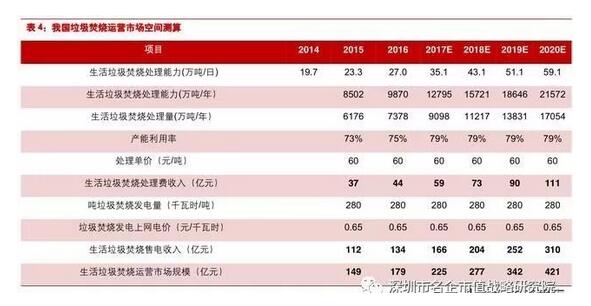 生活垃圾焚燒比例不斷提升;截至 2015 年,焚燒發(fā)電占我國(guó)生活垃圾處理總產(chǎn)能的比重為 31%,離“十三五規(guī)劃”的 2020 年達(dá)到 54%還有一定差距?!笆逡?guī)劃”中提到至 2020 年我國(guó)垃圾焚燒處理能力達(dá)到 59.10 萬(wàn)噸/日,我們假設(shè)處理能力每年增量相同,則 2017-2020 年每年需要增加 8.02 萬(wàn)噸/日的垃圾焚燒處理能力,2018-2020 年均復(fù)合增速將達(dá)到 17.1%。根據(jù)我們的預(yù)測(cè),至 2020 年我國(guó)生活垃圾焚燒運(yùn)營(yíng)市場(chǎng)將達(dá)到 400 億元/年。