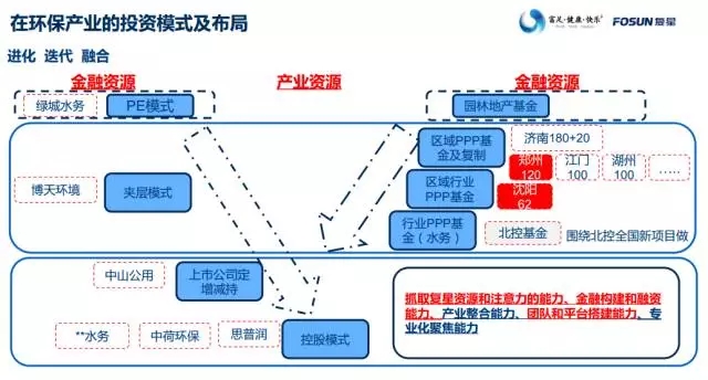 戴海峰在《環(huán)保投資熱下的冷思考》演講中提出:“環(huán)保+”成為當(dāng)下中國資本市場風(fēng)口之一,超過500億市值的環(huán)保上市公司已經(jīng)出現(xiàn);“復(fù)星集團投的不僅僅是錢,更多的是多資源對接、上下游合作等,從而創(chuàng)造更多的產(chǎn)業(yè)協(xié)同價值?!碧岢鲋挥挟a(chǎn)業(yè)整合,利用大資金、大平臺、強團隊、大生態(tài)才能創(chuàng)造機會和價值。