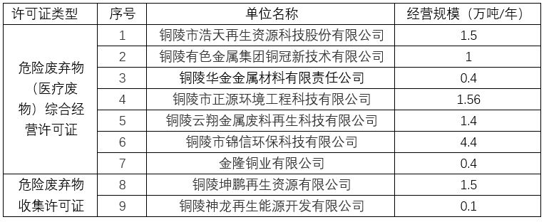 表格 3 銅陵市危險(xiǎn)廢棄物經(jīng)營(yíng)單位一覽表