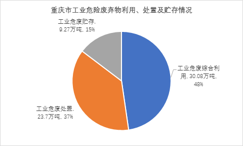 二、危險(xiǎn)廢棄物:2017年,重慶市全市共產(chǎn)生工業(yè)危險(xiǎn)廢棄物60.50萬(wàn)噸,其利用、貯存和處置情況如下圖。