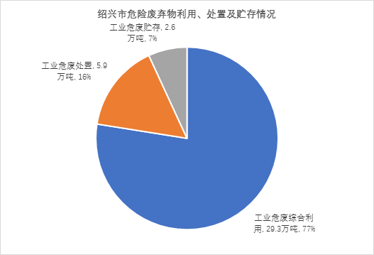 二、危險(xiǎn)廢棄物:同年度,紹興市全市工業(yè)危險(xiǎn)廢棄物產(chǎn)生量為31.9萬(wàn)噸,利用、貯存和處置情況具體見(jiàn)下圖。