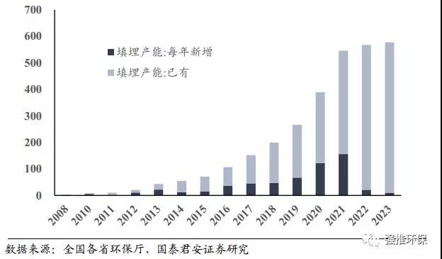 預(yù)計(jì)2021年,全國(guó)填埋處置產(chǎn)能約為512萬噸/年。到2023年底,填埋產(chǎn)能規(guī)模將不低于574萬噸,較之2018年底的200萬噸/年,產(chǎn)能擴(kuò)張彈性為188%。