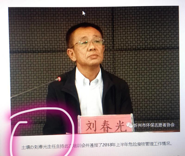 劉春光是山西省忻州市原環(huán)保局的一名工勤人員,曾被提拔成為該局機(jī)動(dòng)車(chē)尾氣檢測(cè)中心主任,2009年因“吃卡拿要”等問(wèn)題被嚴(yán)重警告處分并免職;后又以“忻州市環(huán)保局土壤辦主任”的身份出現(xiàn)。