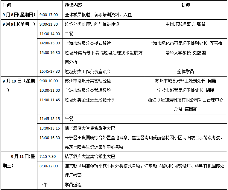 在此背景下,中國(guó)環(huán)聯(lián)擬于2019年9月8日至11日在上海市舉辦第一期垃圾分類(lèi)培訓(xùn),培訓(xùn)內(nèi)容包括垃圾分類(lèi)政策導(dǎo)向與推進(jìn)建設(shè)、垃圾分類(lèi)實(shí)施方案與實(shí)務(wù)操作、上海等相關(guān)城市垃圾分類(lèi)模式分析與經(jīng)驗(yàn)分享等,并組織實(shí)地參觀考察。