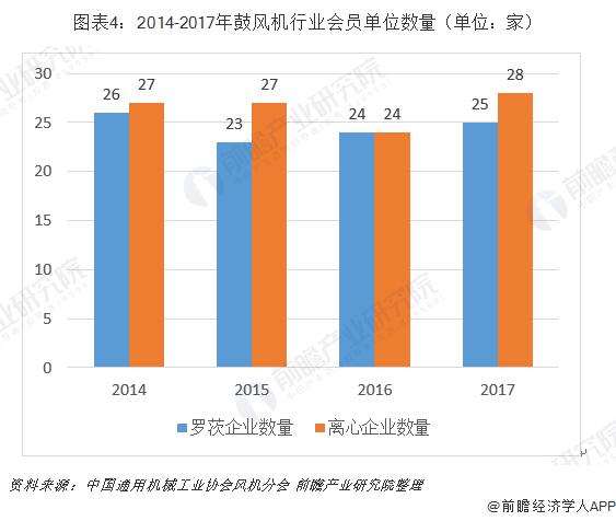 根據(jù)中國(guó)通用機(jī)械工業(yè)協(xié)會(huì)風(fēng)機(jī)分會(huì)統(tǒng)計(jì),截至2017年底,協(xié)會(huì)會(huì)員單位生產(chǎn)離心鼓風(fēng)機(jī)的企業(yè)有28家,比上年增加4家;生產(chǎn)羅茨鼓風(fēng)機(jī)的企業(yè)有25家。