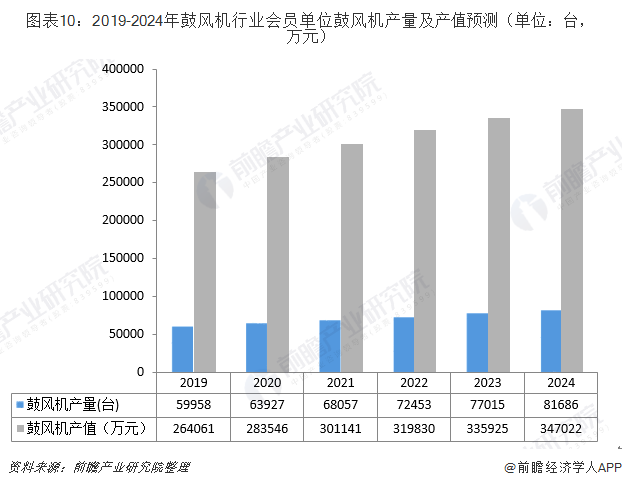 未來(lái),國(guó)內(nèi)分布式能源、垃圾發(fā)電、污水處理、大氣污染治理行業(yè)的持續(xù)推進(jìn),將進(jìn)一步刺激鼓風(fēng)機(jī)行業(yè)的需求。同時(shí)競(jìng)爭(zhēng)態(tài)勢(shì)看,國(guó)內(nèi)鼓風(fēng)機(jī)企業(yè)與國(guó)外優(yōu)秀鼓風(fēng)機(jī)品牌在技術(shù)上的差距在逐漸縮小,未來(lái)國(guó)內(nèi)鼓風(fēng)機(jī)企業(yè)將進(jìn)一步占據(jù)國(guó)內(nèi)鼓風(fēng)機(jī)市場(chǎng)份額?;谝陨蟽牲c(diǎn)考量,前瞻認(rèn)為,鼓風(fēng)機(jī)市場(chǎng)仍有較大的發(fā)展空間,預(yù)計(jì)到2024年,會(huì)員單位鼓風(fēng)機(jī)產(chǎn)量將突破8萬(wàn)臺(tái),會(huì)員單位鼓風(fēng)機(jī)產(chǎn)值將突破34億元。