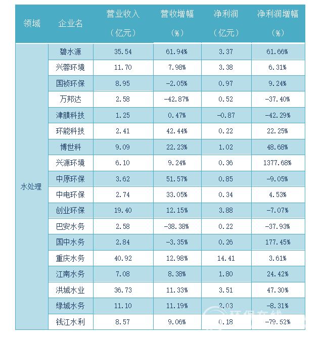 整體來看,18家水處理上市企業(yè)實現(xiàn)較快增長,其中11家收入和利潤整體實現(xiàn)雙增長,共計實現(xiàn)營業(yè)收入213.2億元,凈利潤36.45億元。只有4家企業(yè)營收出現(xiàn)同比下滑,碧水源、環(huán)能科技、中原環(huán)保收入增幅則達(dá)61.94%、42.44%及51.57%。具體如下圖所示: