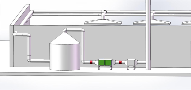 針對這種工況,草木綠設(shè)計的凈化方案是,淬火爐、回火爐廢氣在收集后,經(jīng)噴淋塔洗滌,再通過草木綠自主研發(fā)設(shè)計的雙極靜電式油霧凈化器進行集中過濾,最后經(jīng)煙囪達標排放??紤]到熱處理工序產(chǎn)生的廢氣帶有火苗,所以,草木綠設(shè)計加裝了防火罩、防火閥等防火措施。廢氣先經(jīng)噴淋塔洗滌,也能起到防火作用。