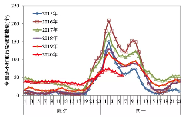 圖3 近六年除夕至初一全國逐小時(shí)重污染城市數(shù)量