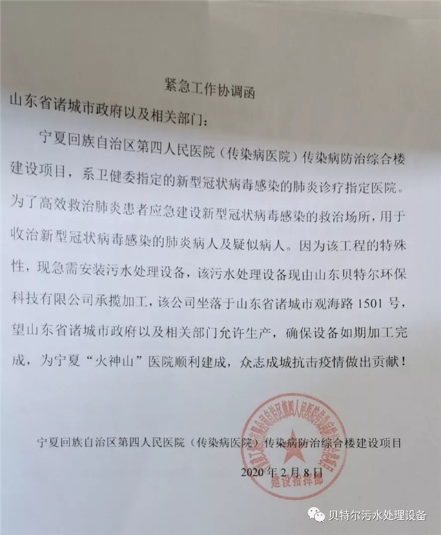 2019年底,臨近春節(jié),當(dāng)全國(guó)人民沉浸在節(jié)日的祥和中時(shí),一場(chǎng)突如其來來的疫情蔓延開來,陰云籠罩在神州大地。武漢告急!湖北告急!全國(guó)進(jìn)入一級(jí)響應(yīng),各地紛紛伸出援手,一時(shí)間,應(yīng)急物資源源不斷的運(yùn)往武漢。疫情就是命令,作為一家以致力于環(huán)保事業(yè)的企業(yè),山東貝特爾環(huán)保科技有限公司更是義不容辭,全員一心,共克時(shí)艱,為緩解疫情肆虐下醫(yī)院污水處理的巨大壓力,積極準(zhǔn)備制作醫(yī)院污水處理設(shè)備。在接到寧夏回族自治區(qū)第四醫(yī)院(傳染病醫(yī)院)的求助信函時(shí),第一時(shí)間組織員工,加班加點(diǎn)為寧夏第四醫(yī)院趕制兩套醫(yī)院污水處理設(shè)備,并于2月11日連夜運(yùn)往寧夏,為寧夏“火神山”醫(yī)院順利建成,眾志成城抗擊疫情做出貢獻(xiàn)!中國(guó)加油!
