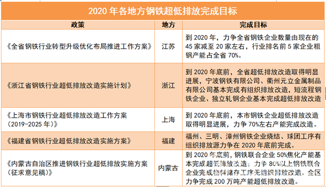 到了2020年,在上述提到的國家目標(biāo)要求下,也是這些地方完成鋼鐵超低排放改造、排放限值執(zhí)行的一個時間節(jié)點,具體見下表: