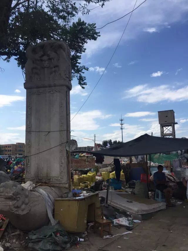 7. 廢品回收站什么寶貝都有。在京北以回收站內(nèi),甚至存有一康熙十四年(1676)立螭首龜趺碑,碑文內(nèi)容涉及清初高級(jí)武將圖海家事以及清史重要事件。這塊康熙諭祭墓碑旁邊是一個(gè)回收玻璃的攤位。