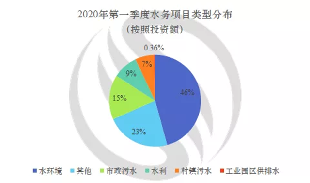 一季度水務(wù)市場(chǎng)整體概況:市政污水項(xiàng)目數(shù)量最多,占比整個(gè)水務(wù)市場(chǎng)超三成;水環(huán)境項(xiàng)目投資額占比最大,占比整個(gè)水務(wù)市場(chǎng)的近一半。(3)
