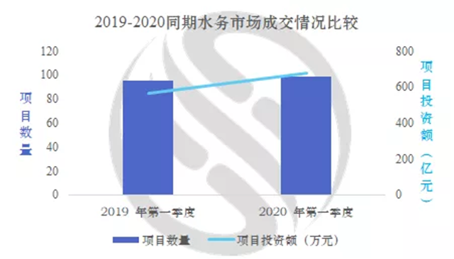 一季度水務(wù)市場(chǎng)走勢(shì):2月受疫情影響觸底,3月反彈。項(xiàng)目成交數(shù)量與去年同期相比基本持平,成交投資額甚至有所增加,增加了20%。(4)