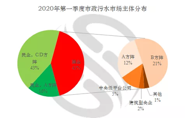 一季度水務(wù)市場(chǎng)主體:水環(huán)境市場(chǎng)以建筑型央企為主;市政污水市場(chǎng)國企/民企四六開。
