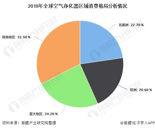 從全球空氣凈化器區(qū)域消費(fèi)格局來看,2019年北美和歐洲的市場(chǎng)份額占比較大,分別為22.70%和20.60%,亞太地區(qū)市場(chǎng)份額占比為24.20%,已經(jīng)超過北美洲和歐洲,其他區(qū)域占比之和為32.50%。