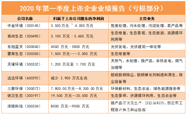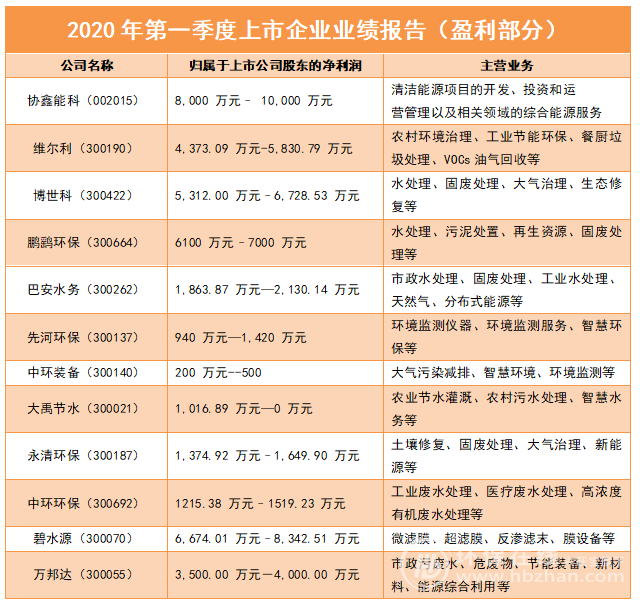 日前,多個(gè)環(huán)保企業(yè)發(fā)布了2020年第一季度(2020年1月1日-3月31日)的業(yè)績(jī)報(bào)告或預(yù)告。受疫情影響,很多工程項(xiàng)目等開(kāi)工延遲、訂單減少,從而影響了很多環(huán)保企業(yè)的業(yè)績(jī)。但仍有很多企業(yè)實(shí)現(xiàn)了盈利,具體有哪些企業(yè)呢?
